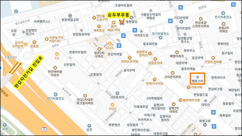 1. 버스로 이동하여 동서울이나 강남고속터미널에서 망원동 왕복