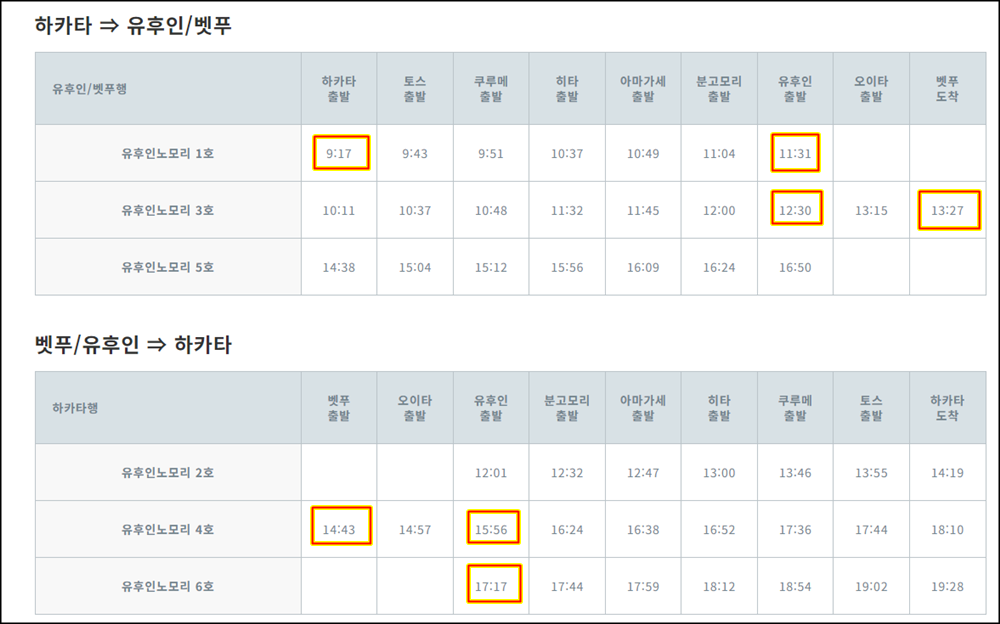 벳푸 출발 유휴인노모리 이용하여 유후인에 갈 수 있다.