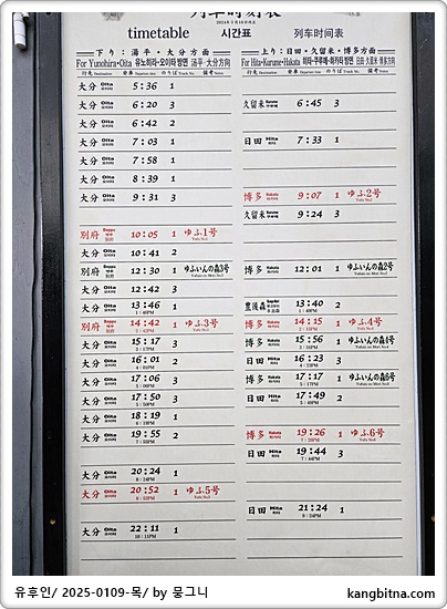 유후인역에 도착하여 일단 오이타와 벳푸로 가는 기차편 사진 찍었다.