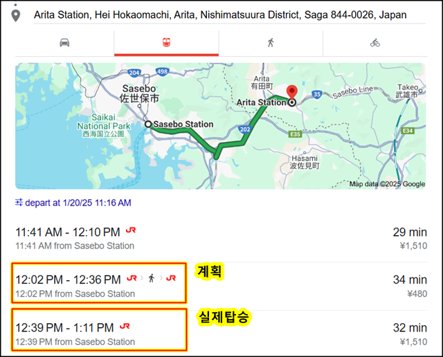 정리하면서 검색해 보니 일반열차를 하이기에서 갈아타고 다시 아리타로 가는 것이었다.