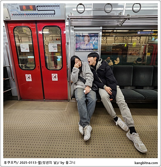 메이노하마까지 오는 전철에 밤에 놀러나가는 오늘 성년식을 치른 청년들이 많았음.