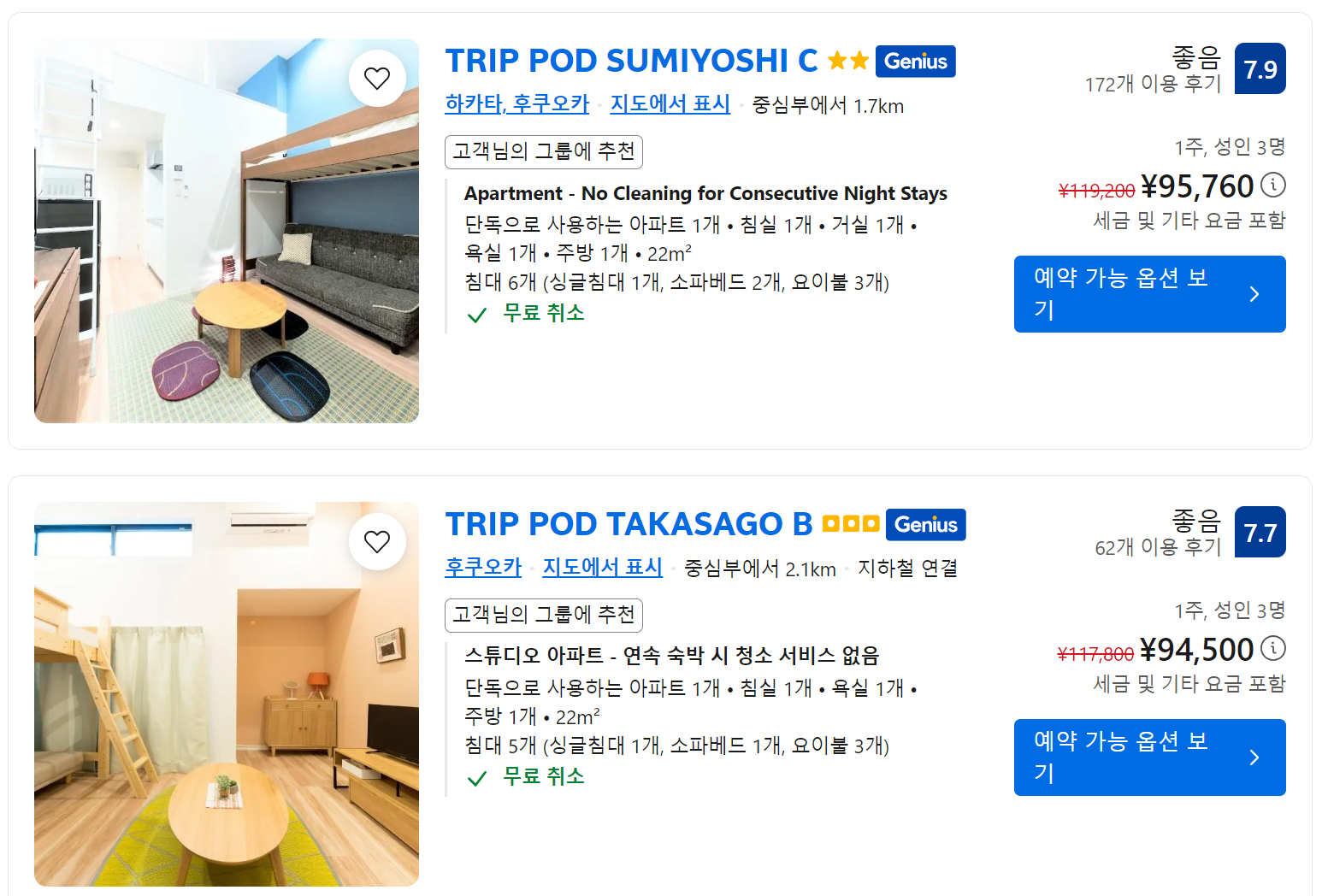 지난 여름 산용산인패스를 이용할 땐 오카야마에 6박, 이번엔 하카타역 주변에 7박을 예약했다.