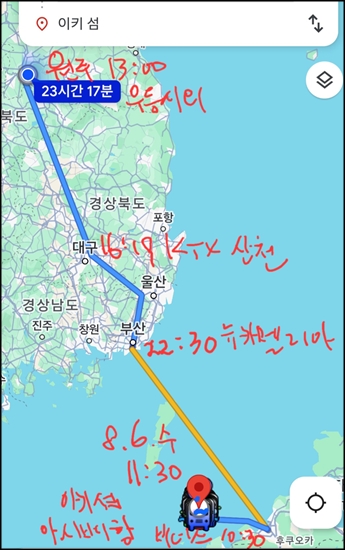 오전에 부산-히타카츠(대마도)-버스이동-이즈하라(대마도)-이키섬으로 이동하는 방법이 있다.