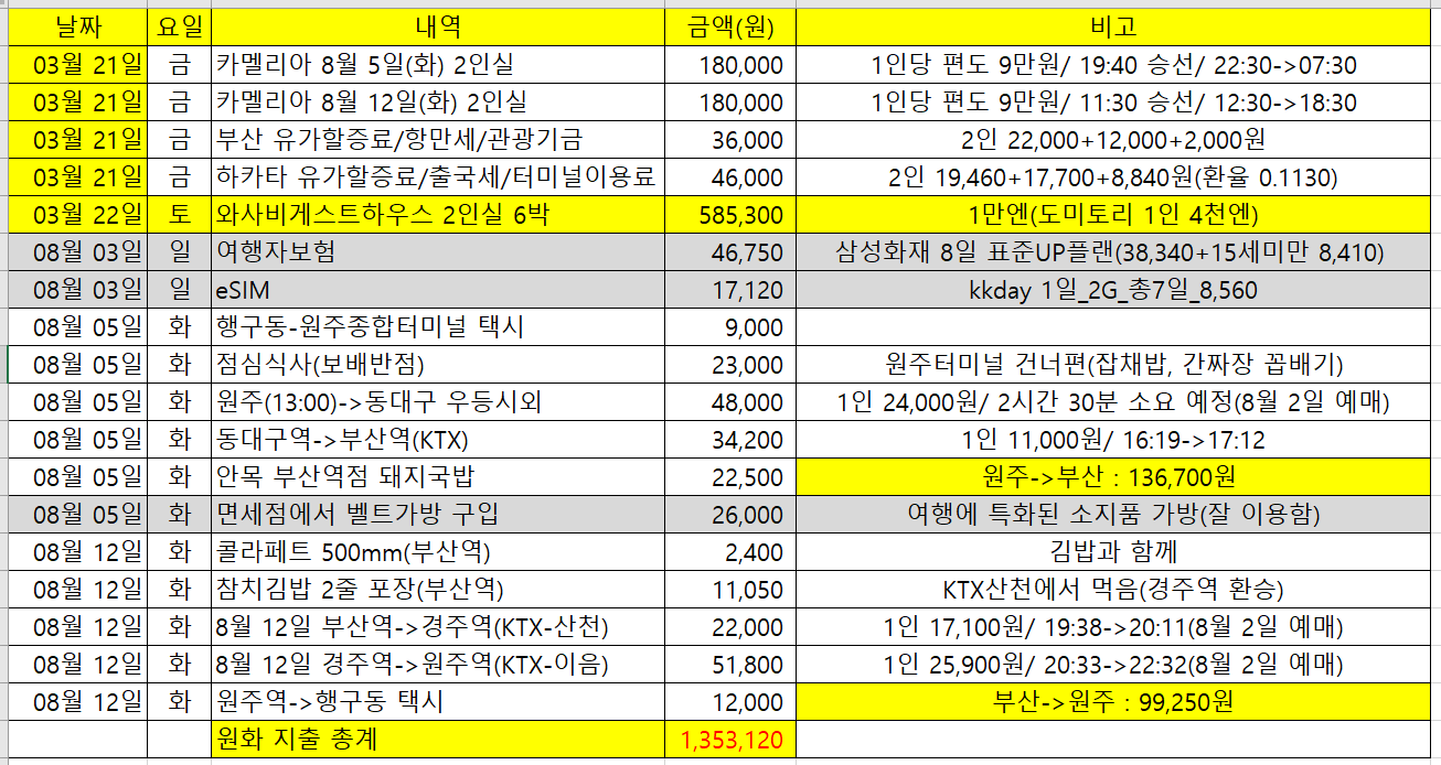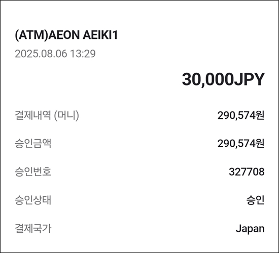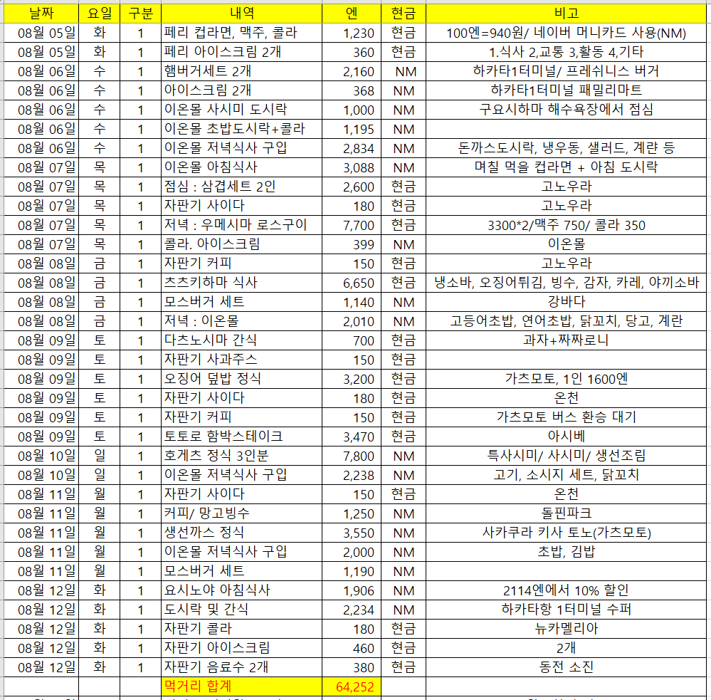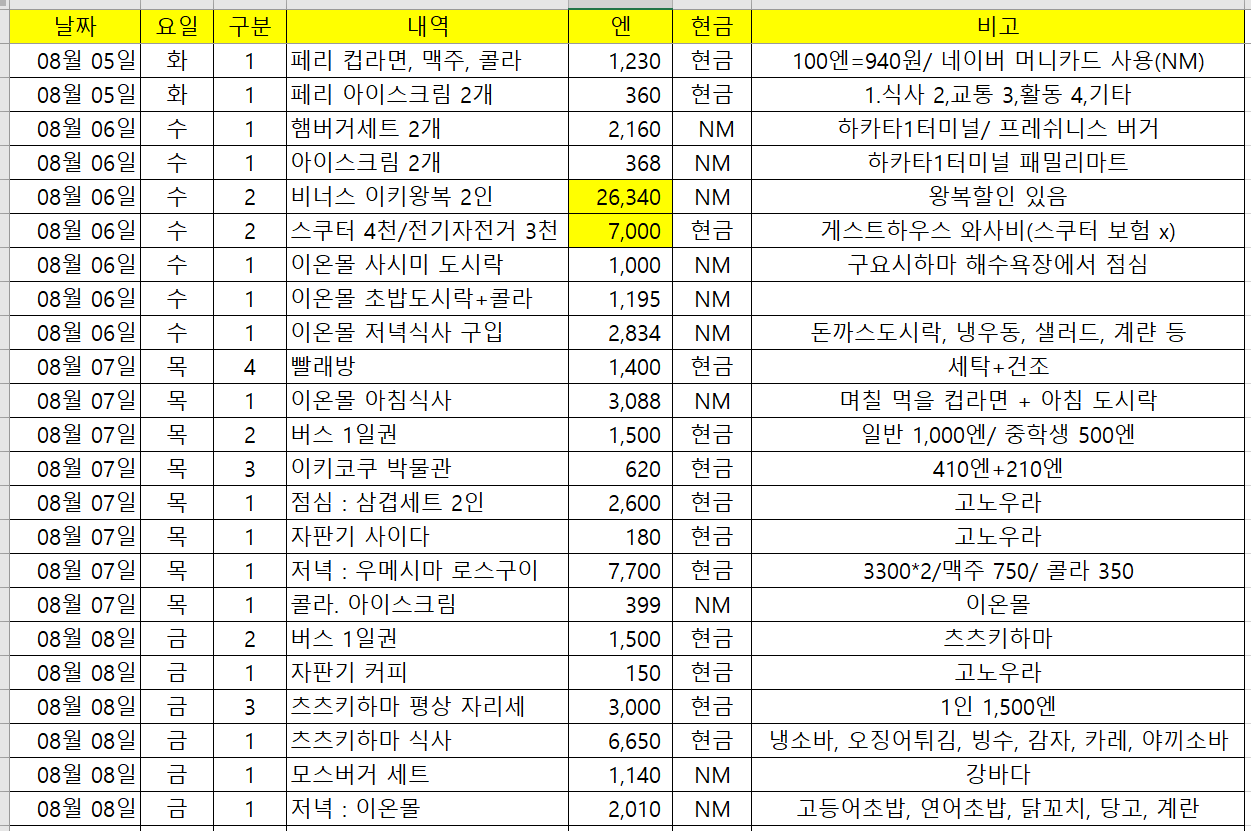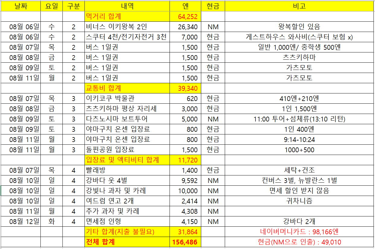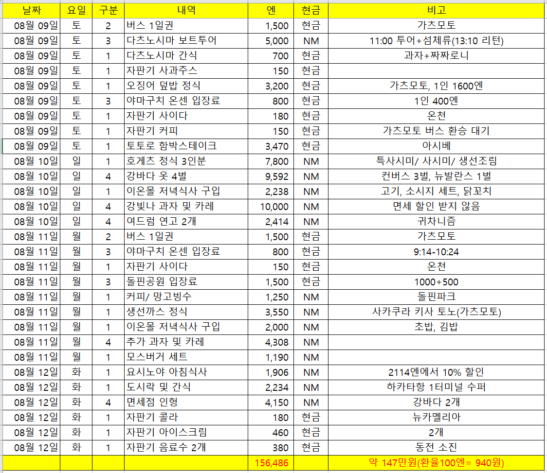 엔화로 사용한 비용 156,486엔/ 환율 940원 적용하면 147만원