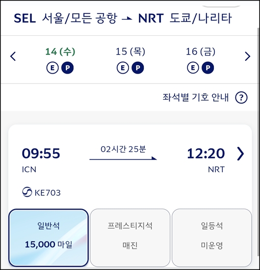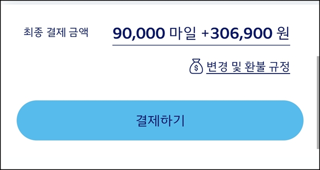 마일리지 이용하여 편도 항공권 예약(15000마일 + 5만원)
