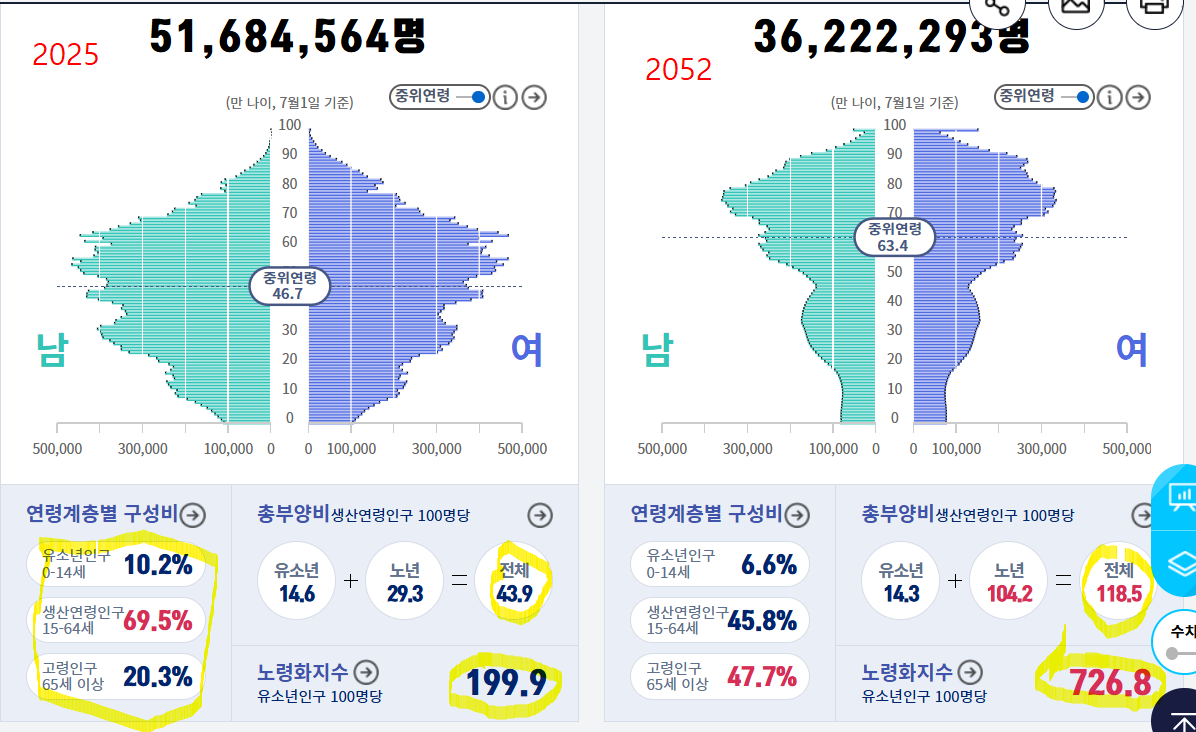 인구추계로 2052년 우리나라 인구는 3600만명이 된다.