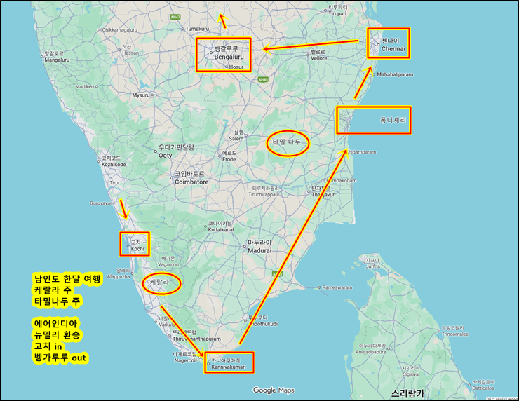 케랄라와 타미나두 주를 한 달 정도 여행하는 코스...