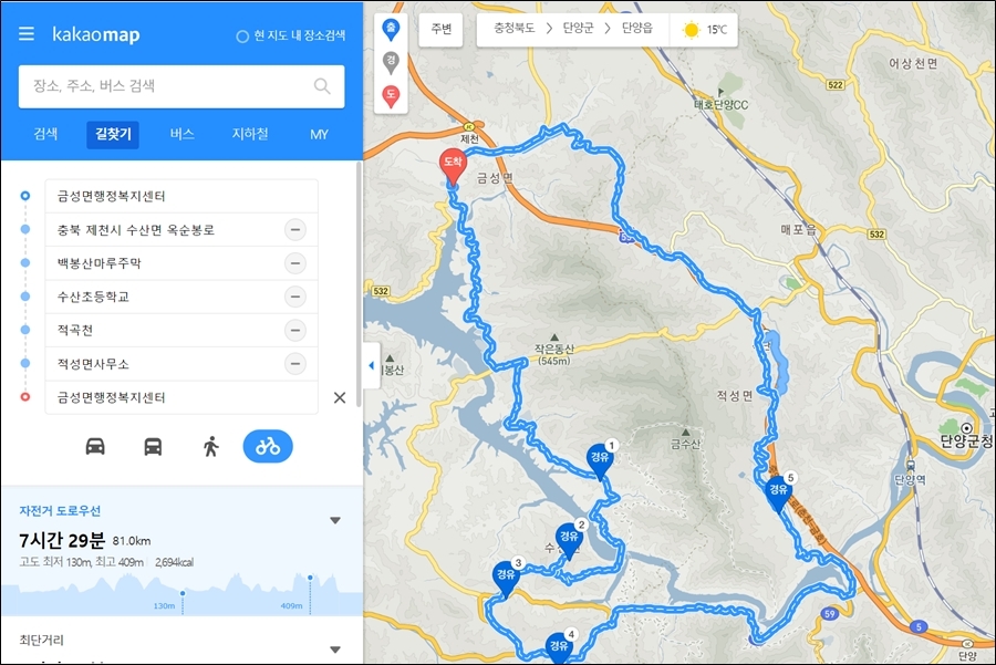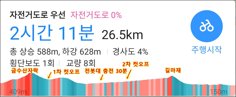 길을 헤매지 않기 위해 카카오맵 자전거주행로드 켬.