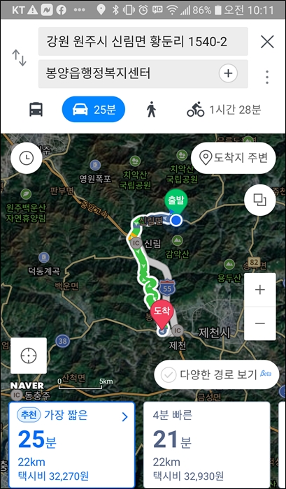 제천까지 가지 않고 중간에 지름길로 꺾어져 들어감