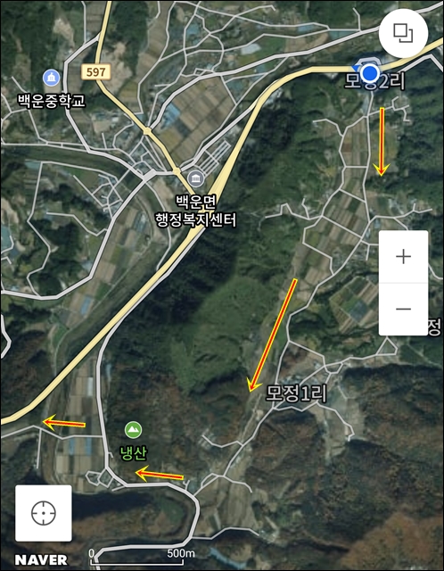 백운을 통과하지 않는 우회도로로 이용하여 모정리 마을 통과