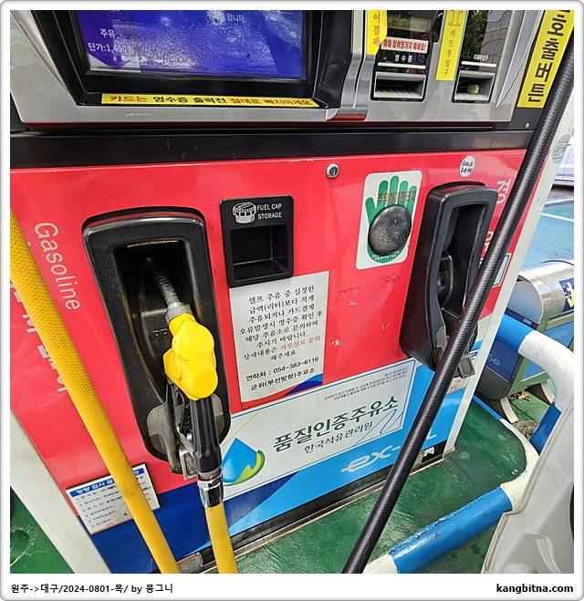 우리 동네랑 주유기 색깔이 달라서 경유 누르고, 휘발유 호스 들음.