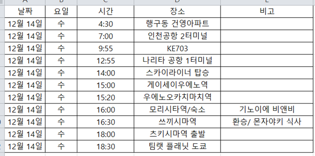 첫째날 일정을 수기로 만들어봤다.