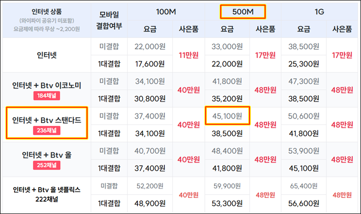 비슷한 수준으로 가입하면 500M 인터넷과 스탠더드